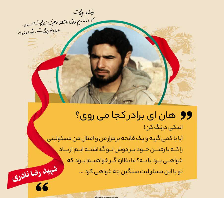 1) اي برادر کجا می روي، کمی درنگ کن آیا با کمی گریه و یک فاتحه خواندن تنها بر مزار من و امثال من مسئولیتی را که با رفتن خود بر دوش تو گذاشته ایم را از یاد خواهی برد یا نه؟ ما نظاره گر خواهیم بود که تو با این مسئولیت سنگین چه خواهی کرد و اما مسئولیت، ادامه دادن راه ماست و ادامه راه ما حضور تو در جبهه است. آنگاه که جبهه نیاز به تو دارد و تکلیف تو حضور در جبهه است.