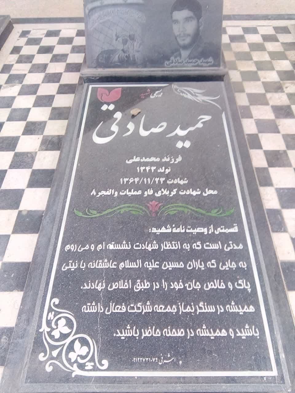 برای اولین بار با واسطهگری شهید محمد لطفی در سن ۱۵ سالگی عازم جبهه شدم سفری که در نهایت منجر به عملیات والفجر ۸ با رمز یا زهرا بر روی رود اروند در شلمچه گردید و بسیاری از عزیزان را در آغوش خود کشید. چندی قبل از این اعزام با شهید حمید صادقی آشنا شده بودم چنانچه توصیف ایشان را بخواهم به طور مجمل بیان کنم میتوان گفت که نامی با مسما داشت و در گفتار و کردار براستی صادق بود و هدف و عملش یکی بود و تکیه کلام او صداقت بود. در تاریخ ۱۴ دی ۶۴ جمعی گردان کربلا عازم جبهه شدیم شب اول را در مسجد جامع سمنان گذراندیم شب دوم را در پادگان امام حسن تهران. شب هنگام متوجه شدیم حمید از پادگان خارج شده. نمیدانستیم کجا و برای چه کاری رفته. روز بعد از راه آهن تهران عازم اهواز شدیم. چشمان من هنوز به دنبال دیدار حمید عزیز بود به ناگاه متوجه توقف قطار در ایستگاه قم شدیم و چند لحظه پس از توقف سر و صدای خاصی در واگن پیچید. حمید را دیدیم که با خرید جانماز و مهر و تسبیح و عطر از ایستگاه قم سوار قطار شده بود.